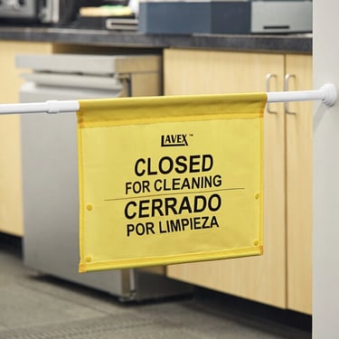 Door hangers, restroom cleaning-in-progress signs, barricade straps, stanchion signs, message placards