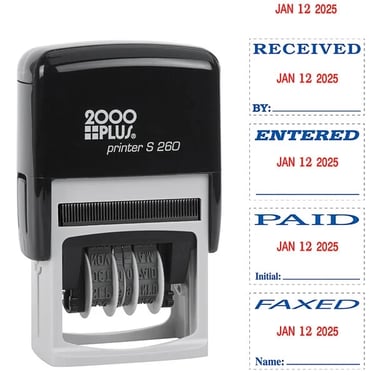 Date stamps, message stamps, ink pads, stamp refills, self-inking stamps