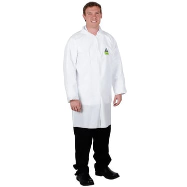 Disposable lab coats, reusable lab coats, snap-front lab coats, knit-cuff lab coats, fluid-resistant lab coats